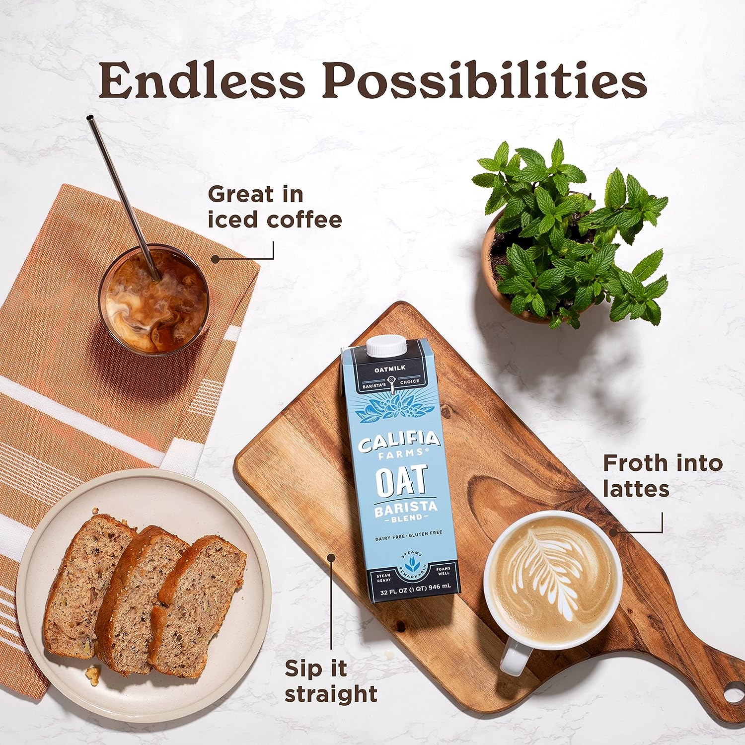 • BARISTA’S CHOICE DAIRY-FREE MILK: Califia Farms Barista Blends are favored by professional baristas across the country for their ability to froth, steam, and form latte art.
